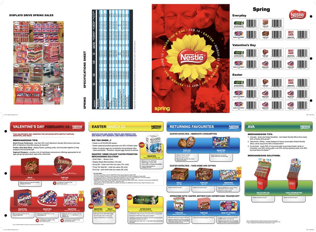 Nestlé required a fresh look for the Spring Retail Season. This point of sale series was made entirely in vector art to maintain a clean, stylish approach. Bilingual typesetting and a pop off flower to capture attention. Vectors from the Vectorvault Vector Library were used to create this look and subsequently the years that followed.