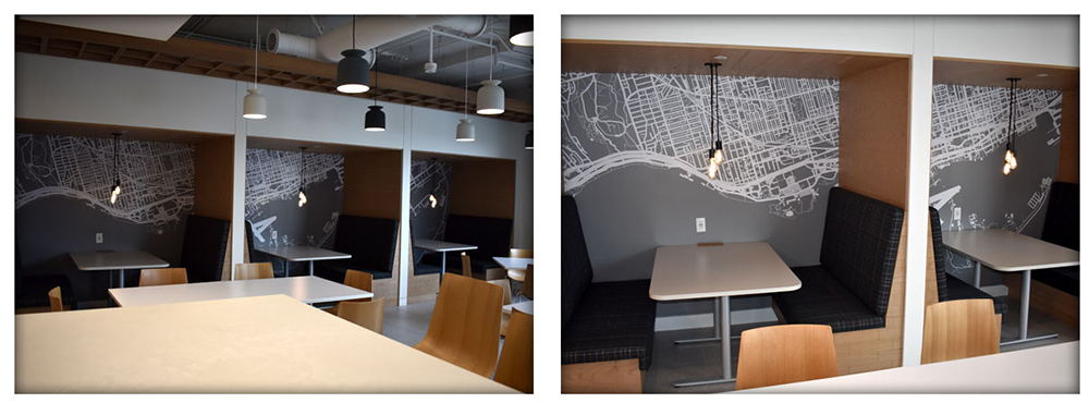 For the main dining area we created a large format vector map of the city. Then we divided it into 3 sections to adhere to the walls within the segmented meeting booths.