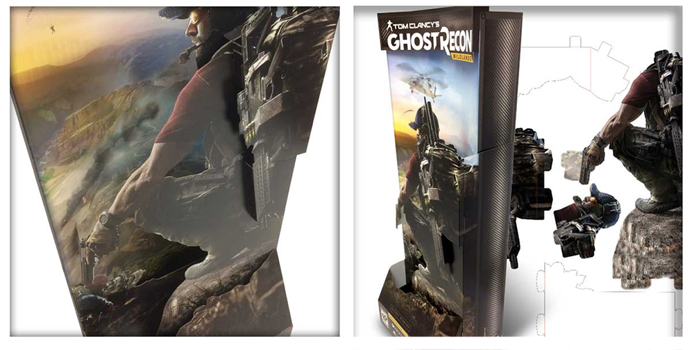 To promote Tom Clancy’s Ghost Recon Wildlands at retail, we were tasked with designing a display that would capture attention. Using high resolution brand elements and imagery, a large format 3D standee was created. No glue was required due to a thoughtfully designed lug system. All of the pieces were packed efficiently in a single shipping box and distributed across Canada.
